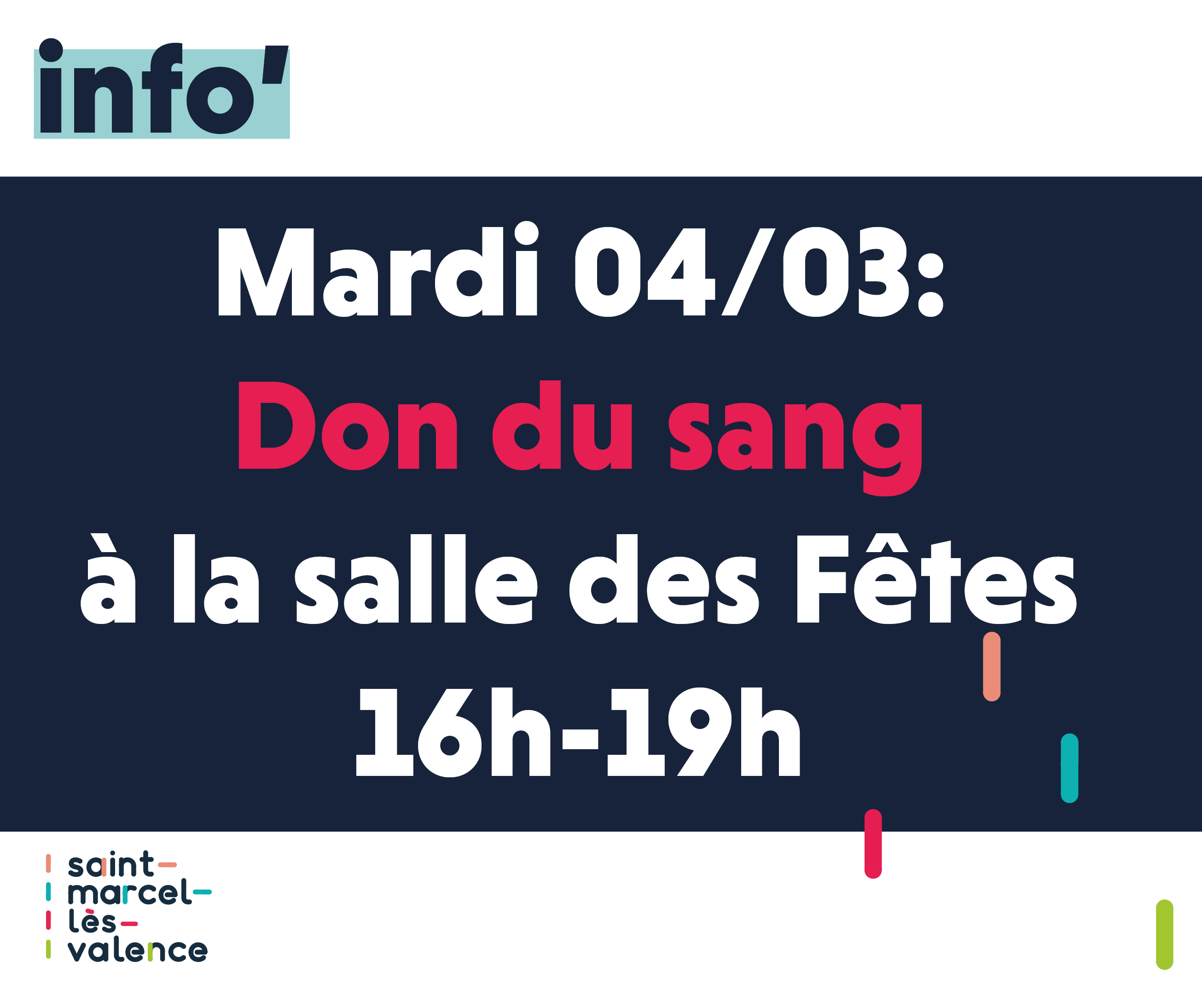 Prochaine collecte du don de Sang le 4 mars 2025 de 16h à 19h à la salle des fêtes de Saint-Marcel-lès-Valence. Privilégiez le RDV : dondesang.efs.sante.fr ou au 04.75.82.44.05.