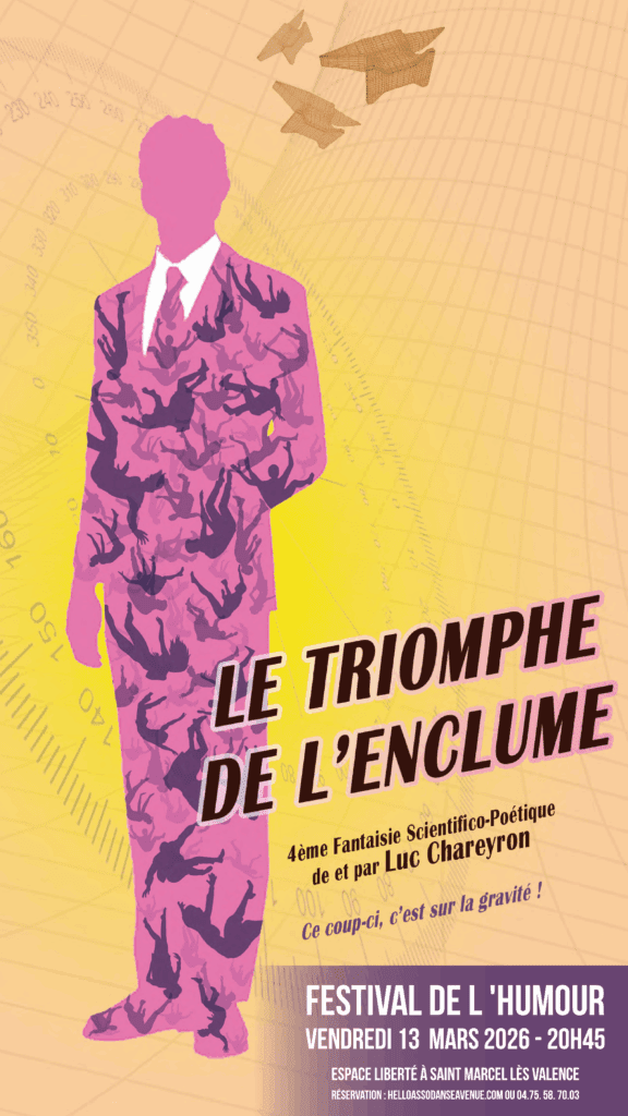 Icare, les femmes et les hommes canons au cirque, les premières machines volantes, les alpinistes, et tant d’autres, les humains attestent d’une quête insatiable des hauteurs. L’humanité, de toute son histoire, témoigne d’une obsession à l’élévation, des corps et des âmes. Toujours en haut de la liste, du box-office, de l’affiche. Tout là-haut ! Or, toutes ces considérations nous ramènent immanquablement à cet autre constat : ce qui nous est commun à toutes et tous, c’est la chute, la gamelle, le bas. Avec son esprit fertile et bouillonnant, Luc Chareyron est l’aspirant poète d’une conférence où philosophie, excentricité et génie burlesque taillent le propos !